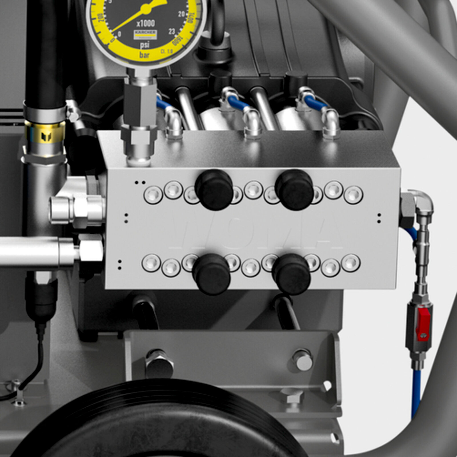 Ideal para uso universal en el sector de la construcción y la industria: nuestra versátil limpiadora de ultra alta presión HD 9/100-4 Cage Classic de la gama compacta UHP. La pieza clave del equipo es su bomba de alta presión industrial extremadamente potente de la marca WOMA, con un alto rendimiento volumétrico. Equipada con una pistola de bypass, la HD 9/100-4 ofrece una presión de trabajo de 1000 bares, procesa hasta 900 l de agua por hora y elimina así de manera fiable y rápida hasta la suciedad más resistente.